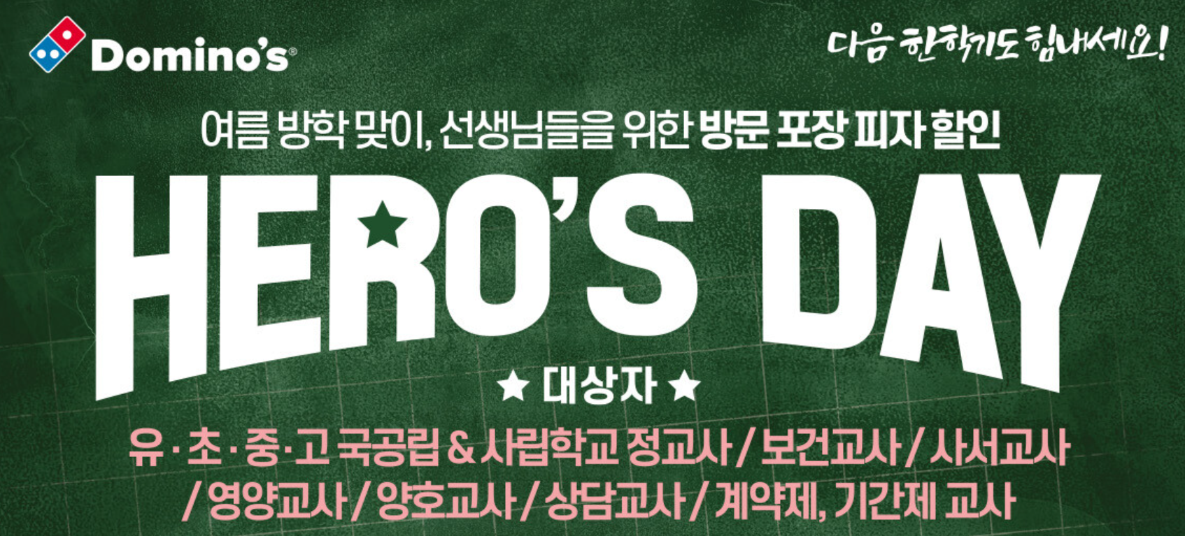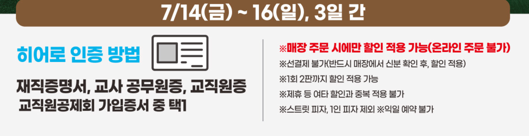 선생님들을 위한 방문 포장 피자 할인 이벤트가 준비되어 있는데요.