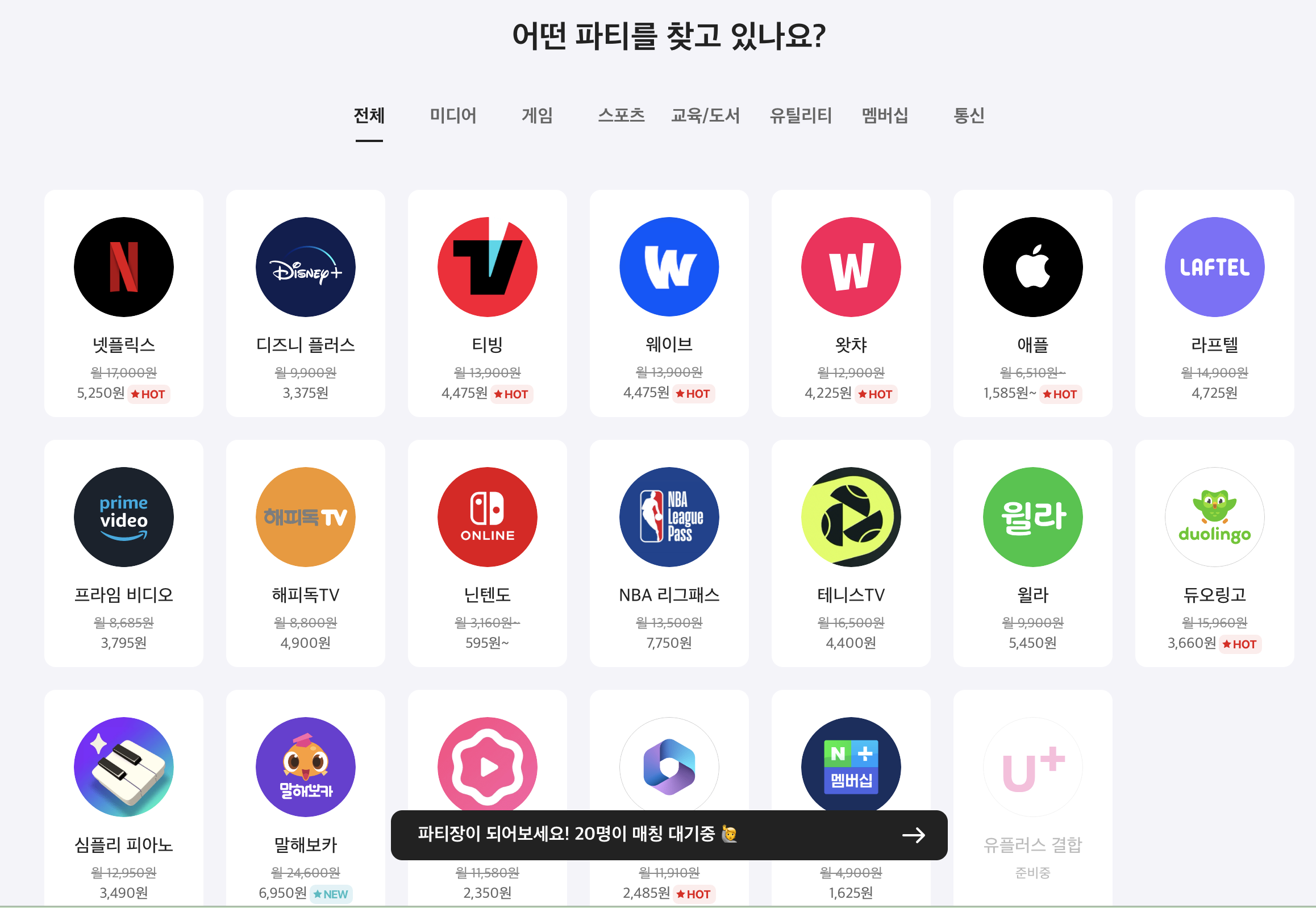 그럼, 월 구독료가 9900원 -> 2965원(파티장 기준), 3465원(파티원 기준)으로 대폭 절감 되네요.
