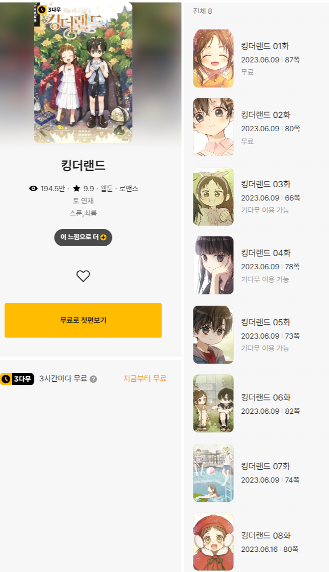 카카오톡 아이디가 있으시면 카카오페이지에서 1, 2화 무료, 3시간 마다 1화씩 무료로 보실 수 있습니다.